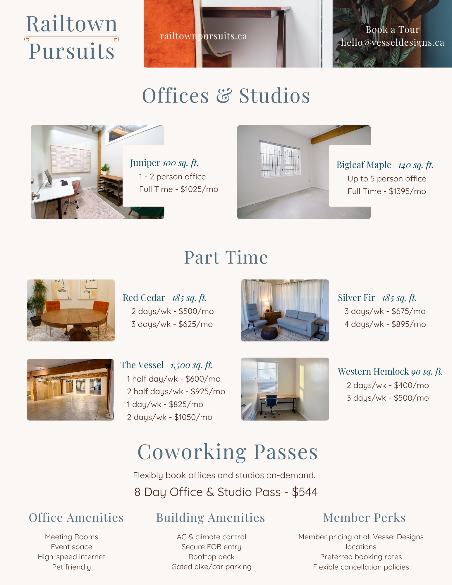 How do part time rentals work? You choose the same day(s) every week (e.g. every Monday, Wednesday, and Friday) and have exclusive use of the studio/office during that time.